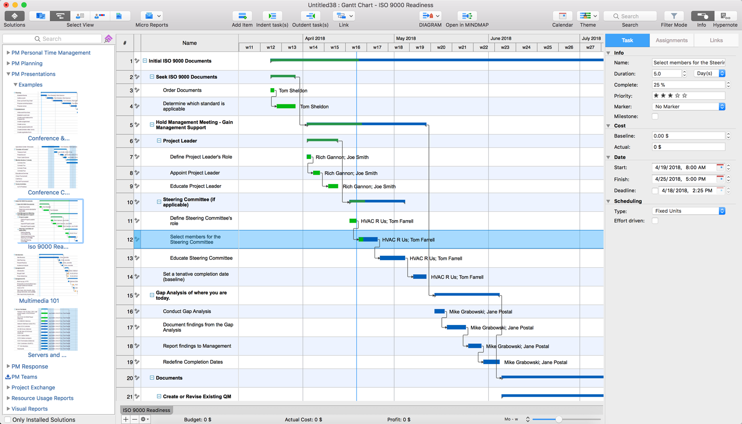 This project example depicts the readiness of ISO 9000 and application of ISO 9000 standards. As for the ISO 9000, it is a series of international quality management systems standards that describes the terms, definitions, and main principles of quality management, requirements to the system of quality management of organizations and enterprises, as well as guidance on the achievement the sustainable results. You can see that this project includes a lot of tasks grouped into phases and even sub-phases, but ConceptDraw's Gantt Chart lets one accurately and visually monitor their implementation.