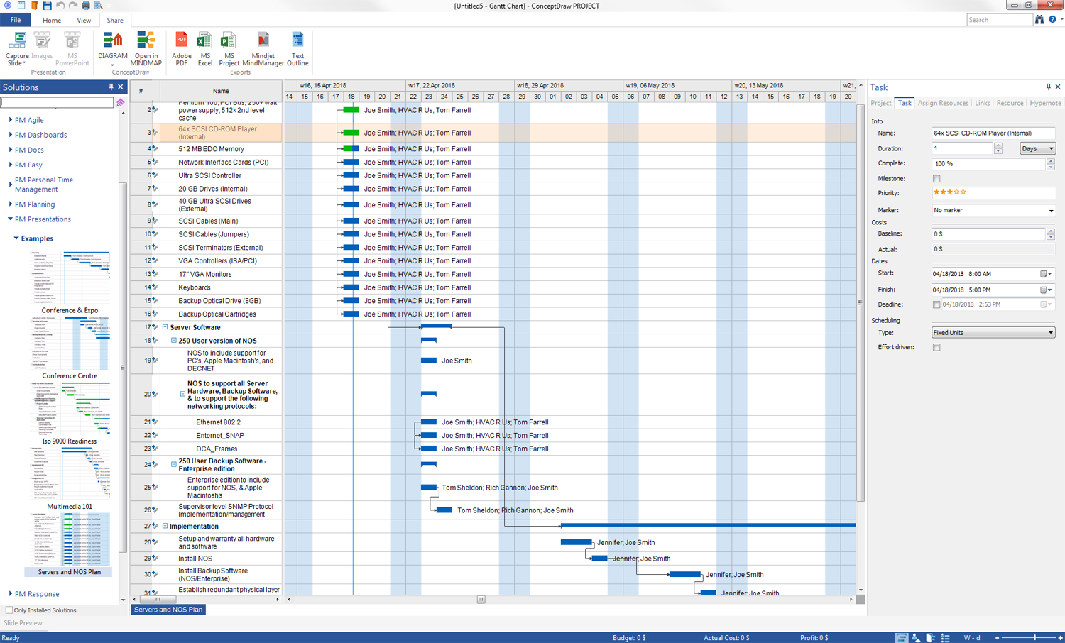The PM Presentations solution extends the power of the ConceptDraw suite products — ConceptDraw MINDMAP, ConceptDraw DIAGRAM and ConceptDraw PROJECT, improving their efficiency at many stages of the project management process by using the same source data to construct the targeted presentation for your audience and clearly interacting with relevant information for different audiences from one source. The main purpose of this solution is to give an ability to the project managers and other team participants to create and to deliver to all stakeholders the capacious presentations representing the data and knowledge of a specific project, and views of the project steps, with the help of including visual dashboards, Gantt charts, resource views, maps, timelines, calendars, project diagrams and reports of varied types. Having the possibility to edit collaboratively in a Full-Screen Mode, the teams can rapidly plan a project as well as execute the tasks of revising and making changes to it.
