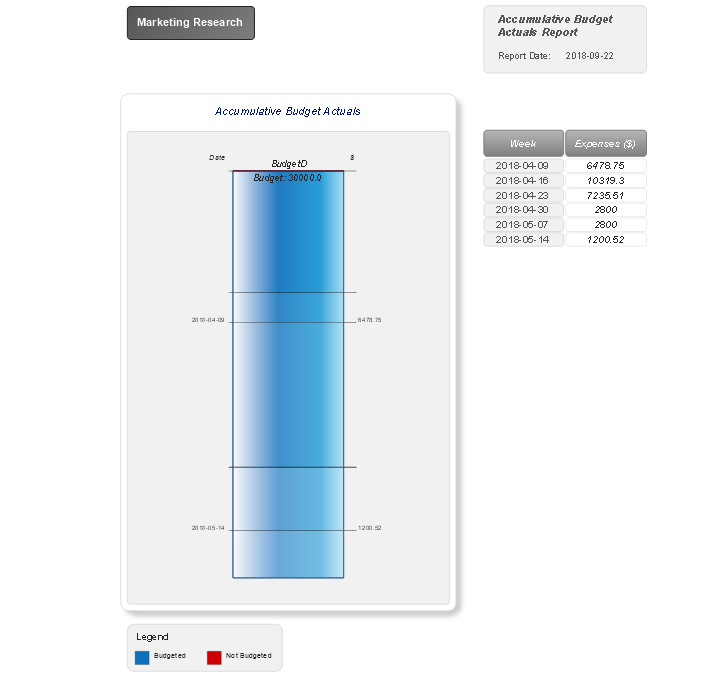 The "Accumulative Budget Actuals" report generated for your project reports includes the information about project’s accumulative budget actuals in a form of Divided Bar Chart. You can see the total amount of budget in a diagram and the table of project expenses by weeks. Moreover, this diagram lets visually compare the budgeted amounts due to the colouring the periods in red that go beyond the budget, while the budgeted periods are coloured in blue.