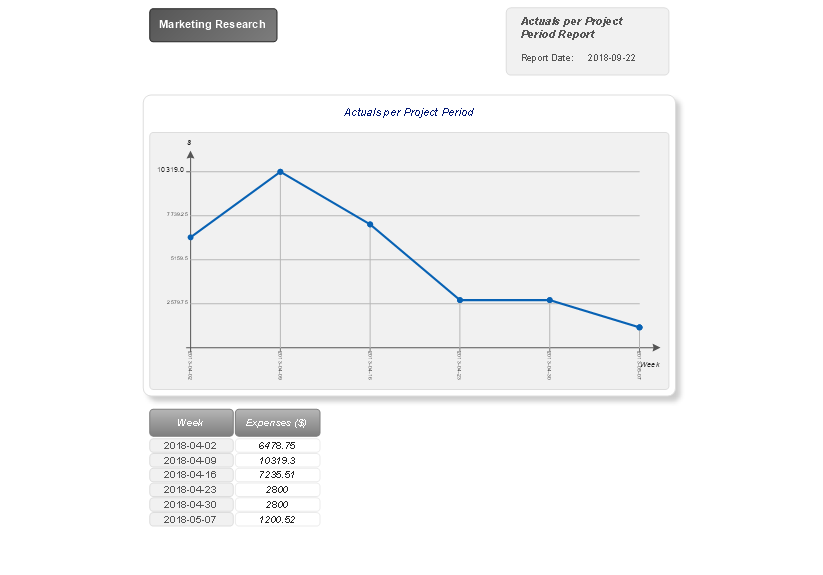 The "Actuals per Project Period" report created for your project illustrates the project's actuals per project report period using a visual form of Line Graph. The graph is divided by weeks and the key points represent the project expenses for each week within a reporting period. In addition, nearby you can observe the project expenses by weeks presented in the table.