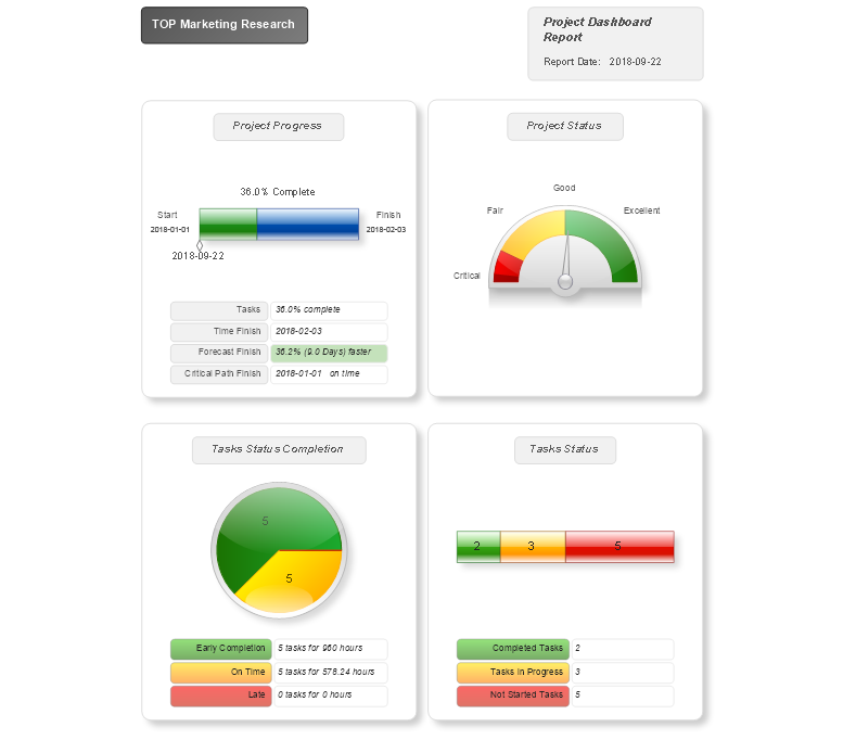 The Visual Reports solution extends abilities of ConceptDraw PROJECT by creating the illustrative and comprehensible reports on a project in a form of visual graphs and diagrams of common types, such as Bar Charts, Pie Charts, Line Charts, Divided Bar Charts, Timelines, Dial Dashboards. This solution allows generating the following types of reports: Actuals per Project Period, Resources Chart, Accumulative Budget Actuals, Tasks Status, Tasks Status Completion, Project Progress, Application of Project Budget Chart, Project Status, and All in One Indicators, which let one report about the tasks statuses, the project progress and degree of its completion, evaluate the project status, depict the project expenses by days and define the days that go beyond the budget, compare visually the actual expenses and expected ones at the project planning stage, generate the Resource chart depicting the utilization of project resources by days, and show other useful information. The set of tailor-made examples included to the Visual Reports solution enables testing the work of listed report types and designating advantages of each of them for the further use in your management work. So, the Visual Reports solution is a highly effective project management tool which helps project managers and other stakeholders to generate the informative, colourful, clear and successful reports during the project implementation.