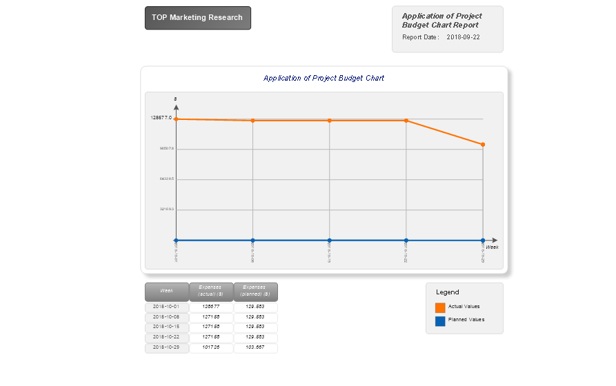 The "Application of Project Budget Chart" report generated for your project is a Line Chart, which depicts the project's planned values that are joined by a blue line and actual values connected by a red line. This visual difference allows comparing the values at a glance, making conclusions and correcting project implementation, if needed. The included table depicts the values of actual and planned project expenses by weeks within a reporting period.
