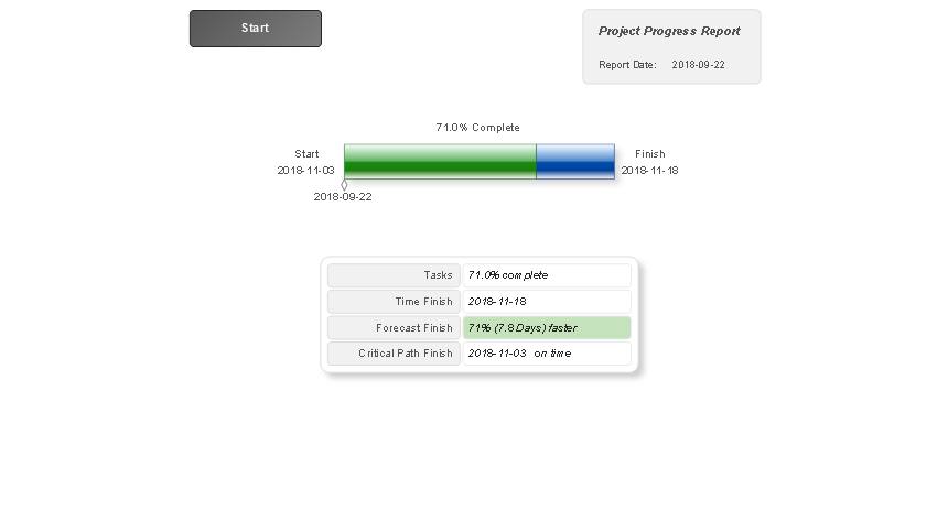 The "Project Progress" report formed for your project narrates about the project progress and degree of its completion using the Timeline Diagram, and also depicts the project numeral values in an accompanying table, such as degree of tasks completion in percent, the planned date of project finish, the forecasted finish date, and date of the critical path finish.