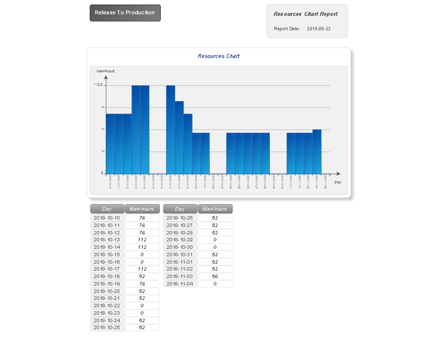 The "Resources Chart" report created for your project depicts in the table and in a Vertical Bar Chart the information about the resources utilization in your project by days, so you can see the number of man-hours per each day within a reporting period in the chart and in the table below the chart.