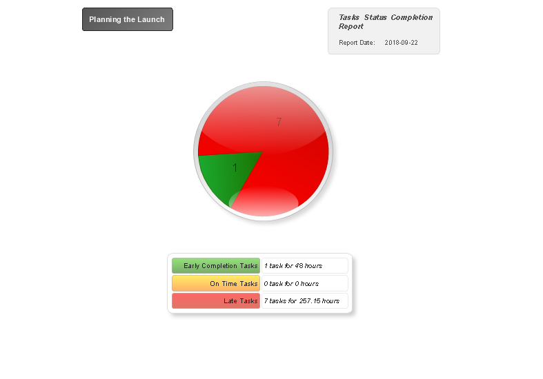 The "Tasks Status Completion" report generated for your project illustrates in a Pie Chart the number of project tasks that are "on time", the early completed tasks and late tasks. Each of these sectors is coloured in yellow, green and red colours correspondingly to be detected in one moment.