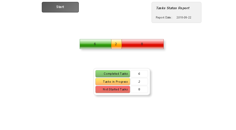 The "Tasks Status" report created for your project represents the Divided Bar Diagram reporting about the project tasks statuses and lets visually compare the number of completed tasks, the tasks in progress and not started tasks in your project. The part corresponding to the completed tasks is coloured green, the tasks in progress are depicted in yellow, and not started tasks in red.