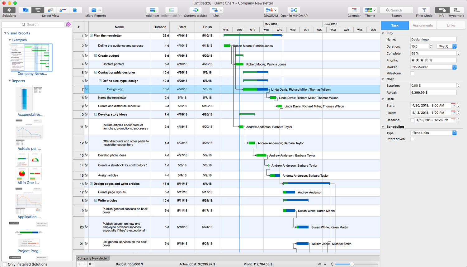This project example is a project on creation of the company's newsletter, its design, editing, layout of articles and graphical information, which includes as well the stages of its publishing and distribution. It is a complex project with many phases and tasks but thanks to ConceptDraw PROJECT we have an ability to structure them neatly and precisely. This example lets you make sure that the projects of any duration and complexity can be easy planned and managed in the ConceptDraw PROJECT software. Besides, this example is the best one to learn more about other opportunities of reports included in the Visual Reports solution.