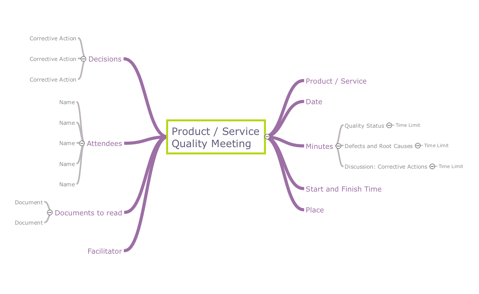 With this Mind Map template, you can quickly prepare for quality meetings on product or service by filling in the appropriate fields. The quality meetings are sufficiently common activities which main goal is capacity to meet the consumer needs by means of improving products, eliminating deficiencies and defects, so increasing their quality. Today the quality meetings become more effective when using Mind Maps. This Mind Map template can be applied to take notes during the meeting, it is also a perfect one-page summary that you'll be able to send to all meeting participants or use later to revise or to present the material yourself to a different audience. The significant points of the quality meeting are common information about the product or service, its name, start and finish time, place, quality status, defects and root causes, as well as attendees, facilitator, decisions and corrective actions, and list of documents to read.