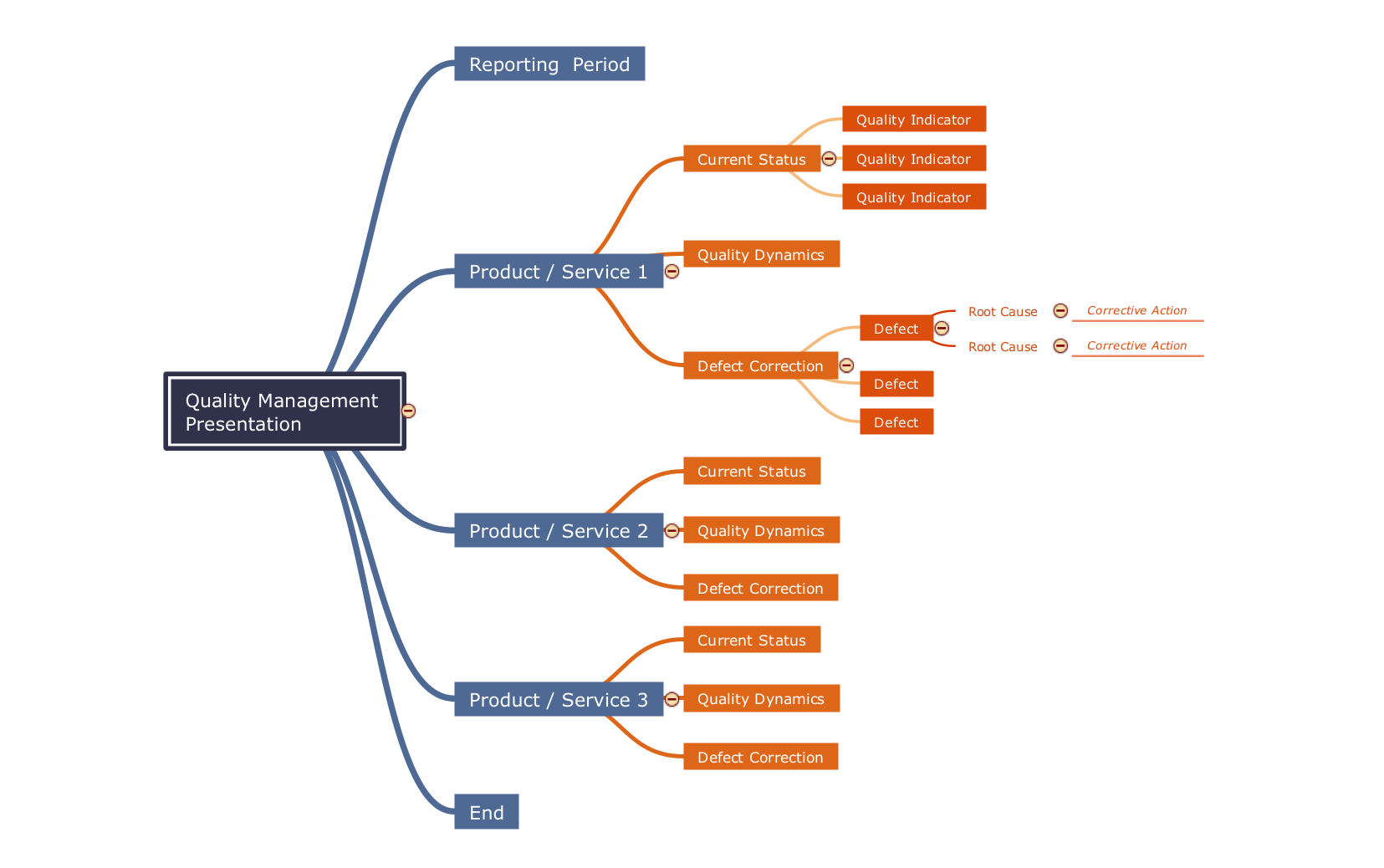 This Mind Map template is dedicated to the quality management presentation. By filling in this template, it is easy to quickly prepare a presentation about any quality process in your company. There are provided the fields for all needed information – reporting period, products or services names, current statuses, quality dynamics, defects correction and root causes. The quality presentations in the form of Mind Maps are illustrative, visual, strict, and contain all important information on one page in an accessible and usable form. The color division lets visually decompose the information, to divide the layers, easier perception and it is desired that it will be executed in harmony with all rest part of your presentation, the color gammas of other illustrations and presentation slides. Typically, the visual instructions are more comprehensible and it is perfect to have this template, ready to be used to describe the visual instructions on any quality management process.