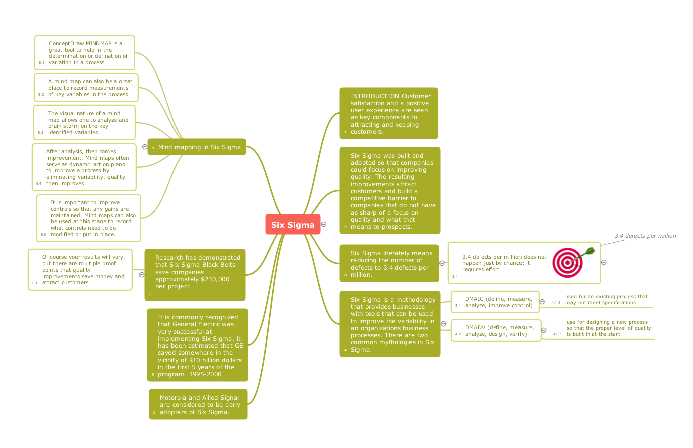 This Mind Map shows how the Six Sigma methodology can be represented as a Mind Map and how Mind Maps help in the application of the Six Sigma conception. The Six Sigma is a popular quality management methodology that provides businesses with powerful tools allowing focusing on improving quality, perfecting the variability in business processes and maximizing the quality of the organization's work. It is based on the statistical methods of management processes, continuous improvement of processes and reducing the number of defects. Thus, the number of defects can be reduced to 3.4 defects per million. The Six Sigma is applied in organizations of various areas, from industrial enterprises to banks, it has found its application in many areas of business, but the main area of its application is production. This methodology is used by many famous companies, such as Motorola, General Electric, Allied Signal, reducing their losses, saving profits and making them successful.