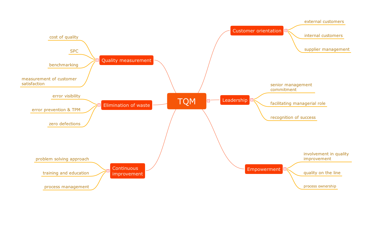 This Mind Map effectively demonstrates how the Total Quality Management (TQM) methodology can be presented in a Mind Map. Total Quality Management is a well-known extensive and structured organization management approach based on the continuous improving the quality of products and services, as well as all organizational processes by using continuous feedback with customers. It is the main idea of TQM that the company should work not only on the quality of products, but also on the quality of organization of work in the company, and improvement the skills of staff. Total Quality Management methodology allows achieving significant business development faster and more efficiently. So, the main points of TQM are the following represented on this Mind Map: quality measurement, elimination of waste, continuous improvement, customer orientation, leadership, and empowerment. The use of mind mapping for quality management is a creative approach that allows structuring all key quality points on one page.