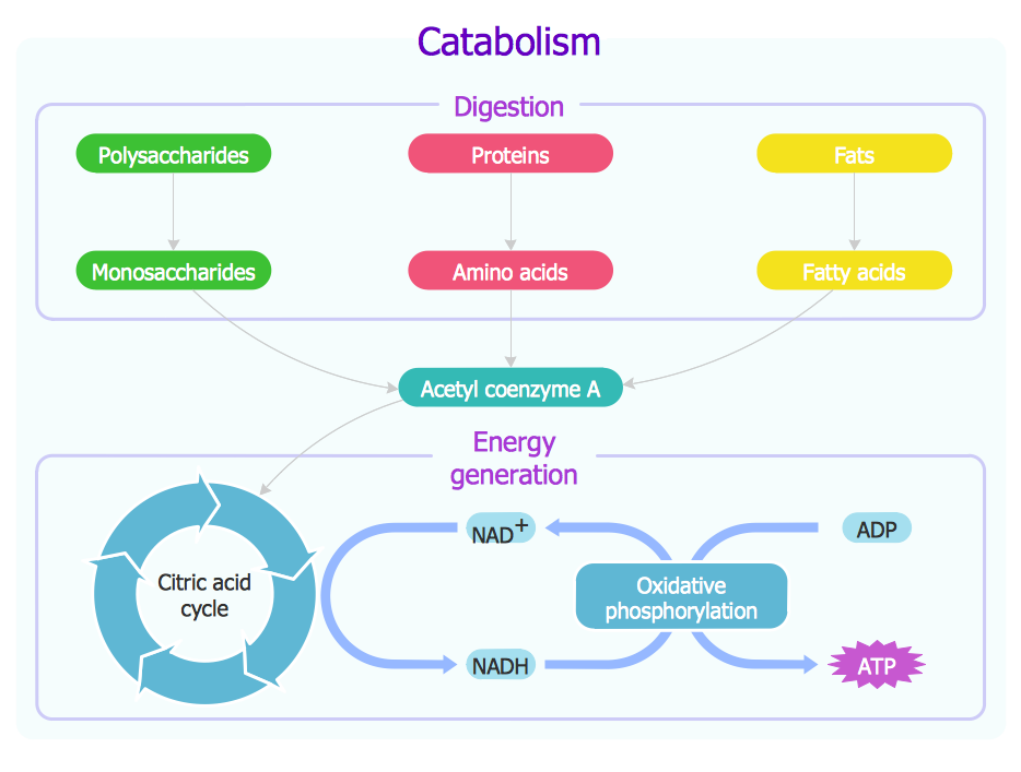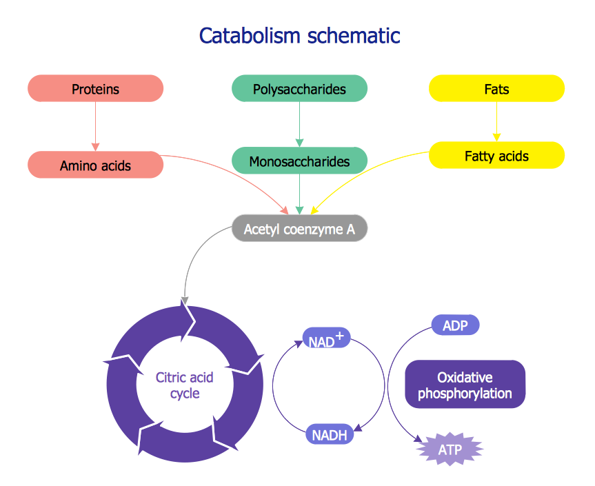 The metabolism is divided by the reactions of catabolism (breaking down organic matter and harvesting the energy) and anabolism (using the energy to construct proteins and nucleic acids). The sample here shows a catabolism schematic, but anabolism is just as simple to represent, using the powerful biological imagery solutions from ConceptDraw DIAGRAM
