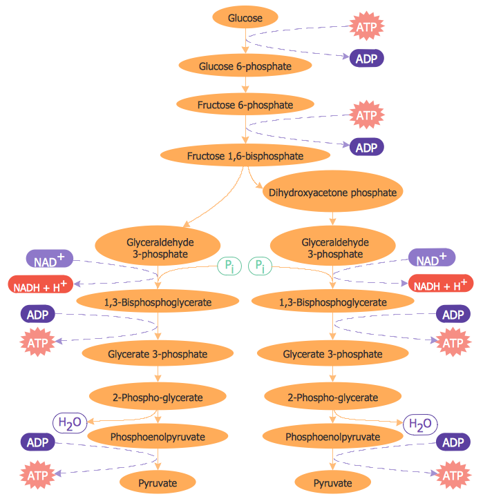 This sample illustrates glycolysis in detail - the process of glucose oxidation, in which from one glucose molecule is formed two molecules of pyruvic acid (pyruvate). This process is carried out for several enzymatic reactions. Glycolysis is one of three metabolic pathways of glucose oxidation that occur in living cells.