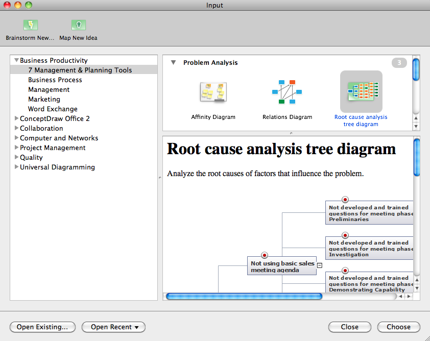 | Start new document using appropriate template | In ConceptDraw MINDMAP use the “Root cause analysis tree diagram” input | MM |