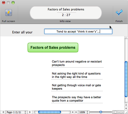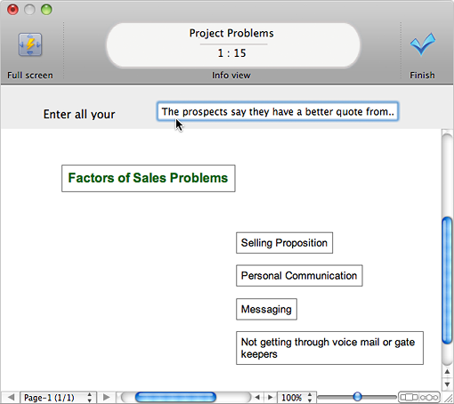 | Collect all factors affecting a problem | Start brainstorm mode, add identified factors to map, collect all input and place in a mind map | MM |