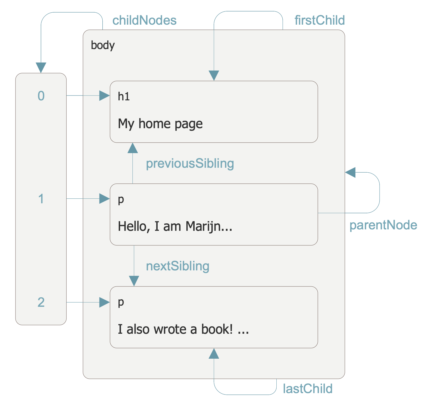 This sample diagram is dedicated to the illustration of the DOM links. Document Object Model is an embedded structure which nodes contain many links to the adjacent nodes. This example shows one link of each type. Each node has the parentNode attribute that indicates to its parent node and the childNodes attribute that indicates to an array-like object, which contains its child nodes. Also, pay attention at the firstChild and lastChild node attributes that point to the first and last child elements. If there are no child nodes, these attributes are set as null. Such attributes as the previousSibling and nextSibling indicate to the adjacent nodes of the same parent as the current node, but that are in the list immediately before or after the current one. The previousSibling attribute of the first node will have a null value and the nextSibling attribute of the last node will be also null.
