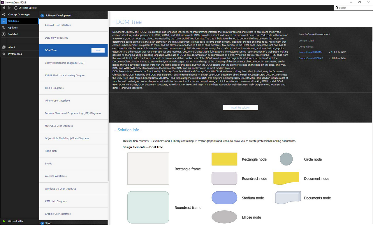 After ConceptDraw STORE and ConceptDraw DIAGRAM are downloaded and installed, you can install the DOM Tree solution from the ConceptDraw STORE.