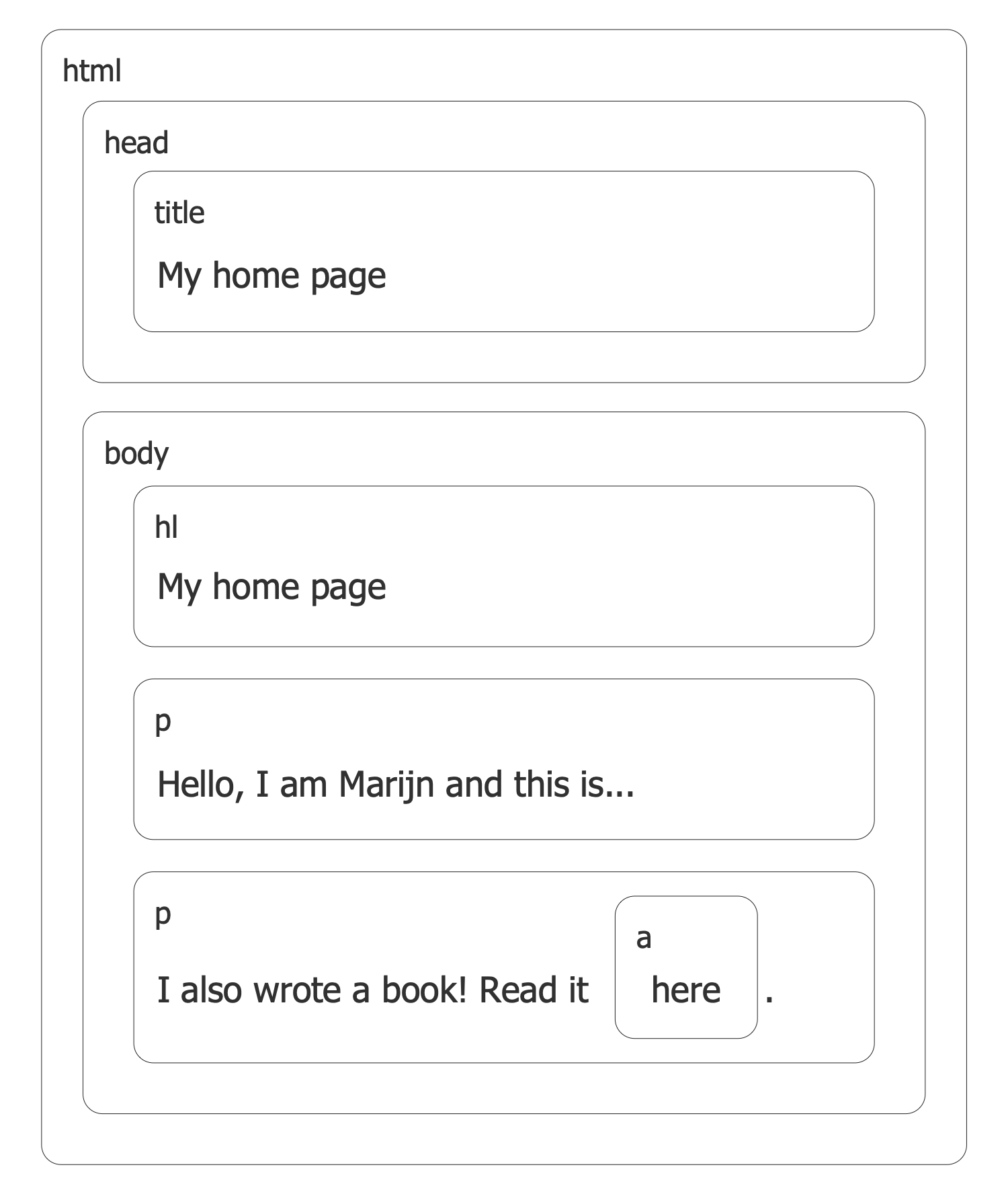 This sample diagram demonstrates graphically the structure of the web page. It is a simple scheme, but more than informative and visual. The boxes represent the nodes and the arrows depict the relationships parent-child between these nodes. DOM is the data structure used by the browser to represent the document, reflecting its form. HTML resembles a set of boxes fitted one into another. The nodes for the elements that represent HTML tags define the structure of the document. Each node can have the child nodes. The tags include other tags, which in their turn include the tags or text. For each box is an object with which we can interact, and about each one it is known what boxes and text it contains. When a web page is opened in a browser, it receives the HTML source text, parses it, builds a model of the document structure, and uses it to draw the web page on the screen.