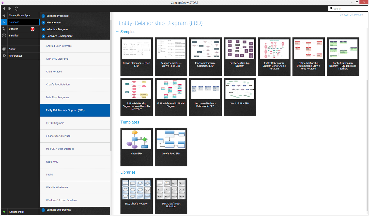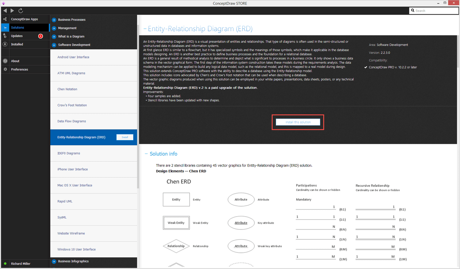 After ConceptDraw STORE and ConceptDraw DIAGRAM are downloaded and installed, you can install the Entity-Relationship Diagram (ERD) solution from the ConceptDraw STORE.