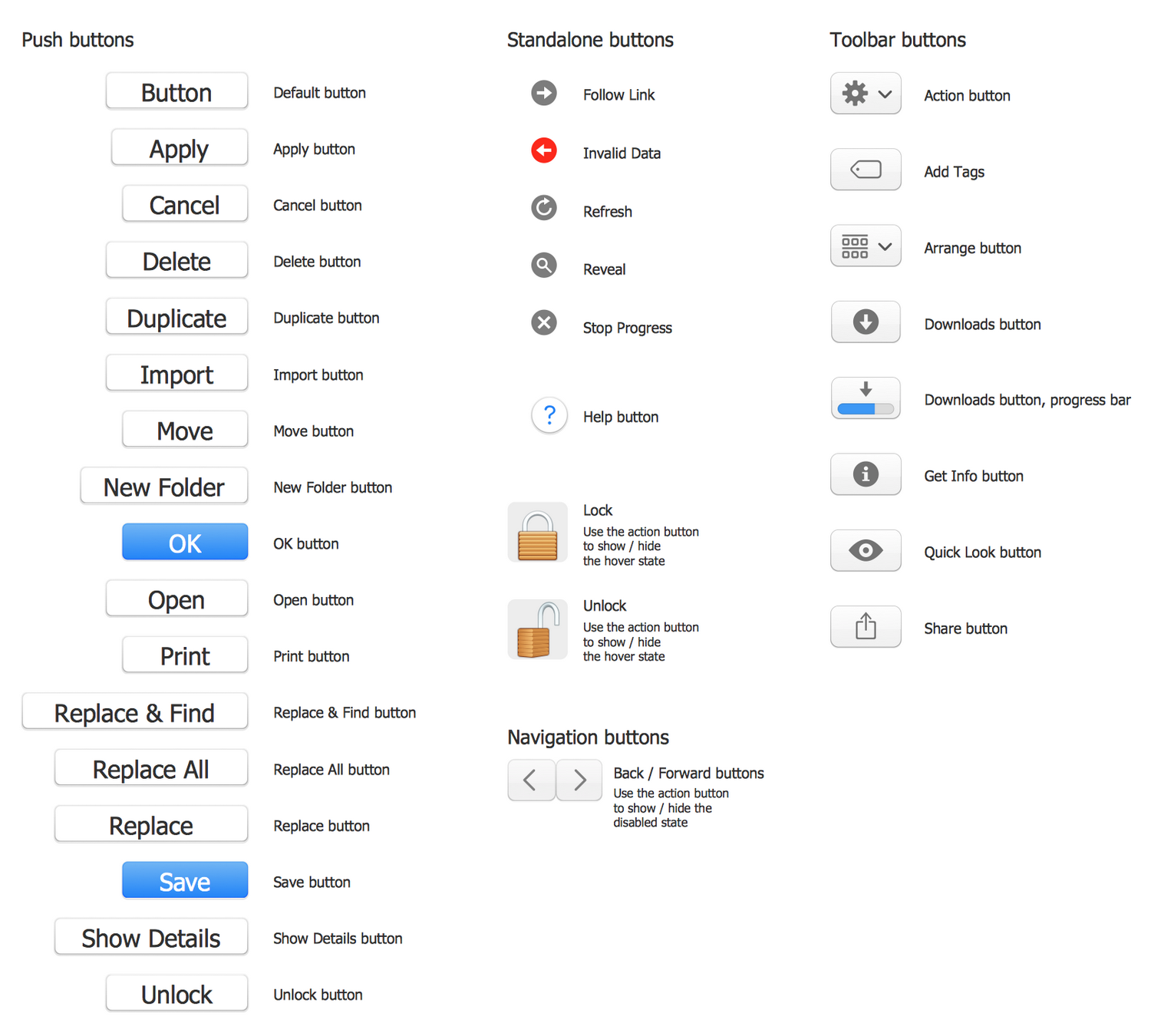 All source documents are vector graphic documents which are always available for modifying, reviewing and/or converting to many different formats, such as MS PowerPoint, PDF file, MS Visio, and many other graphic ones from the ConceptDraw Solution Park or ConceptDraw STORE. The macOS User Interface solution is available to all ConceptDraw DIAGRAM users to get installed and used while working in the ConceptDraw DIAGRAM diagramming and drawing software.