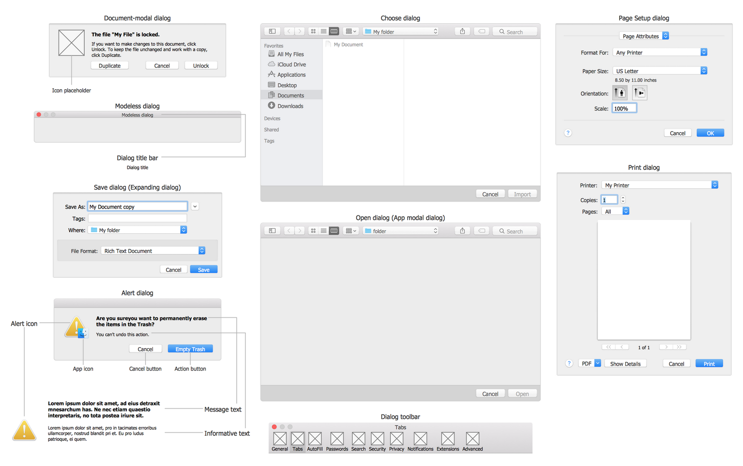 This diagram was created in ConceptDraw DIAGRAM using the set of libraries from the macOS User Interface solution. An experienced user spent 10 minutes creating this sample.