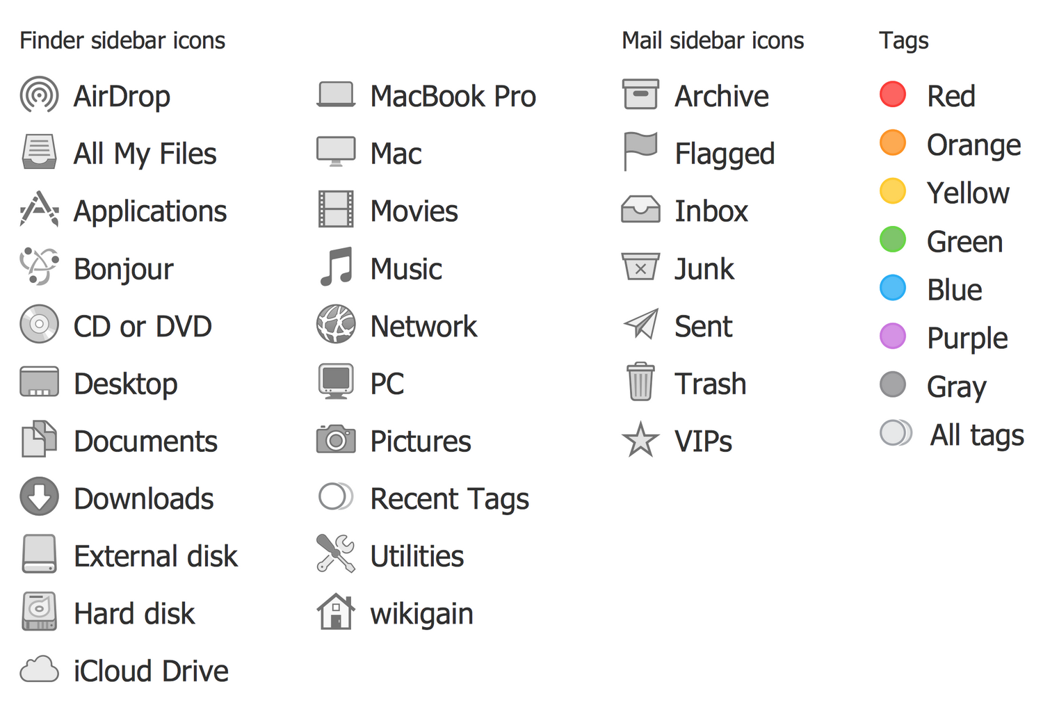 macOS User Interface solution includes a wide range of graphic and diagramming solutions of ConceptDraw Solution Park, and extends ConceptDraw DIAGRAM functionality with powerful GUI software graphic design features and tools. Within macOS User Interface solution ConceptDraw DIAGRAM users can find a wide variety of libraries, containing many pre-designed vector objects of Mac Apps icons, buttons, dialogs, menu bars, indicators, pointers, controls, toolbars, menus, and other elements for fast and simple designing high standard user interfaces of any complexity for new macOS Sierra, and creating visual GUI prototypes and GUI designs for new Mac applications. It also supplies ConceptDraw DIAGRAM software with an extensive range of different macOS 10.12 Sierra user interface design examples, samples, and templates.