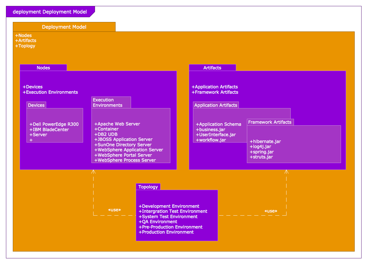 This SysML Package diagram example illustrates a Deployment model structure and was designed based on the Wikimedia Commons file “Deployment Model Structure.PNG”. The SysML Package diagrams are the ideal type of diagrams to be used to visually depict the functionality of a software system and all dependencies between the packages that make up a model. As general, the packages are a universal mechanism for organizing the model elements and diagrams into groups, to group semantically related elements. They are used to depict the different layers of a software system, so to visualize the layered architecture, and may include the use cases. The communication mechanisms can differ from the layer to layer, the labels on the dependencies help to clarify and indicate the used ones. One can benefit from the use of Package diagrams as a way to depict the dependencies between the elements for the systems of any size and complexity, especially they are useful for large scale systems. Due to ConceptDraw’s SysML solution the model based systems engineering is now easier than ever.