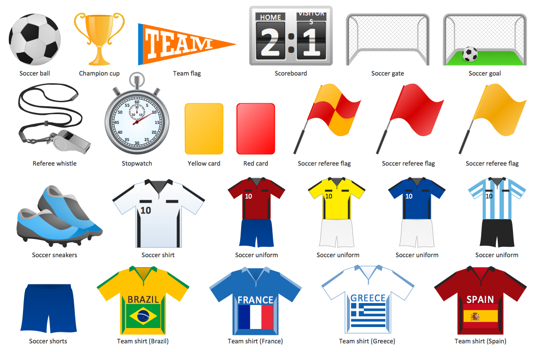 Association football can be called simply as “football” in many countries. The United Kingdom is among such countries. The term “soccer” is more commonly used in the United States and in Canada which does not change the subject. Thus, in case you need to make any “association football”-related drawing, it would look similar to the “soccer”-related one. And to make such drawing look professionally good, the ConceptDraw DIAGRAM charting and drawing software and the Soccer solution may be used. This solution offers the pre-made samples and templates of the soccer diagrams, play schemas, illustrations, and the stencil libraries full of vector objects.