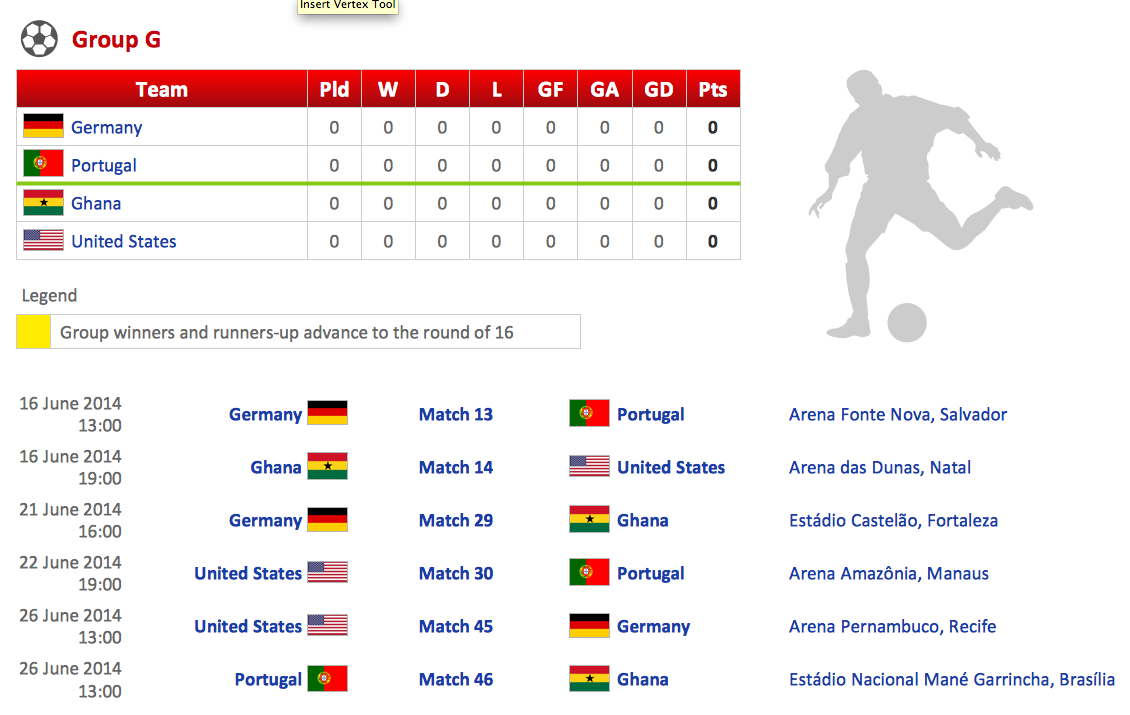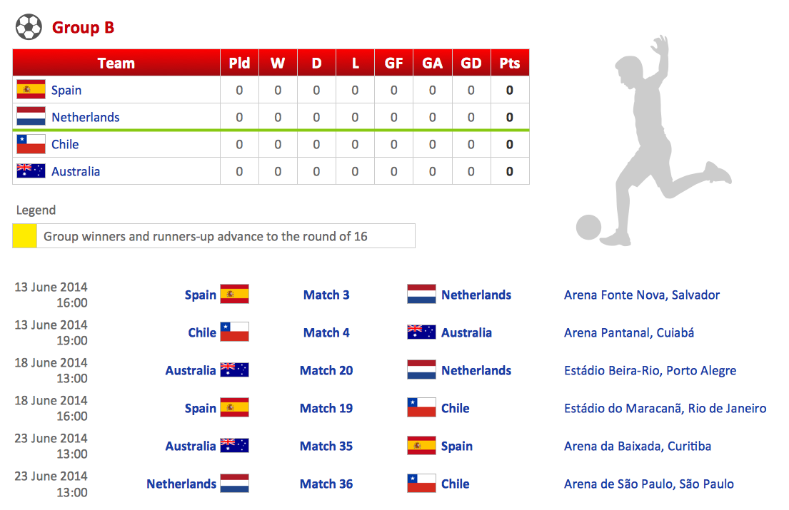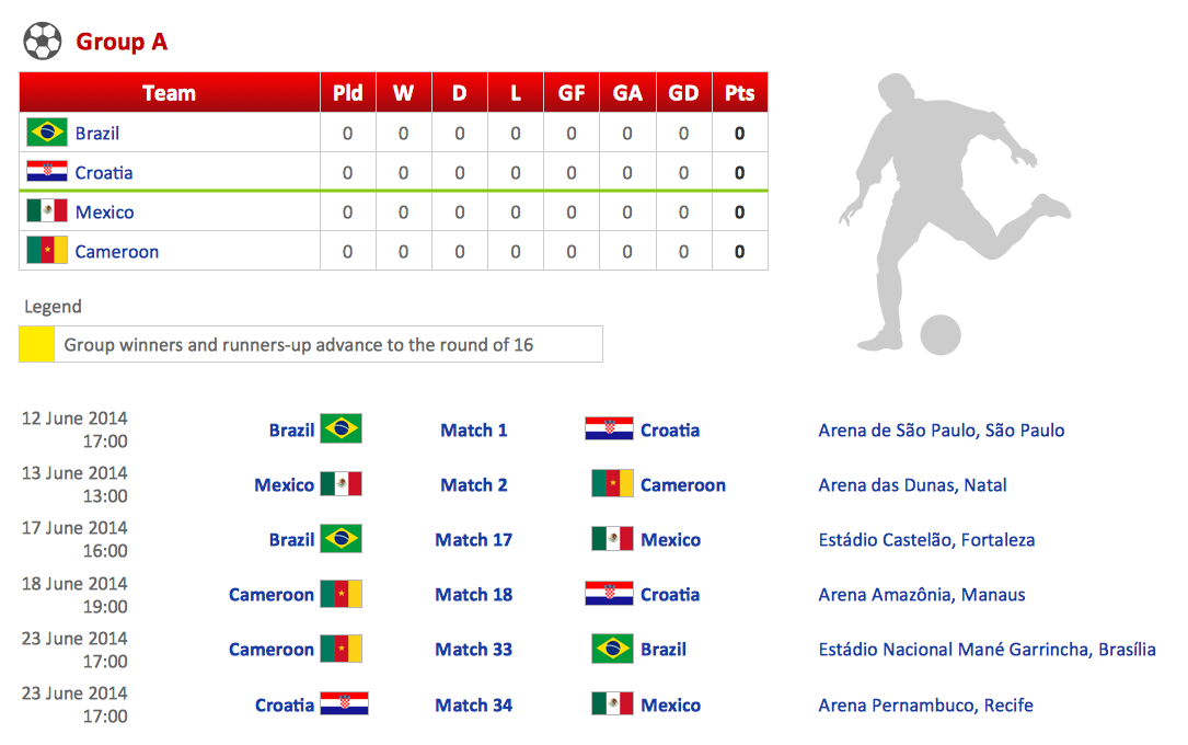 This sample demonstrates the standings of group A on the 2014 FIFA World Cup. It’s very easy, convenient, and quick to create visual and attractive illustrations in ConceptDraw DIAGRAM using the libraries with large number of predesigned vector objects.