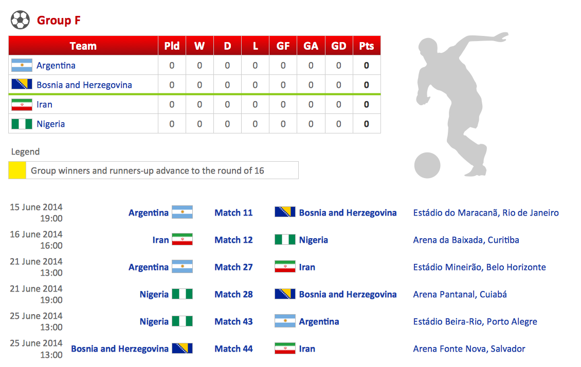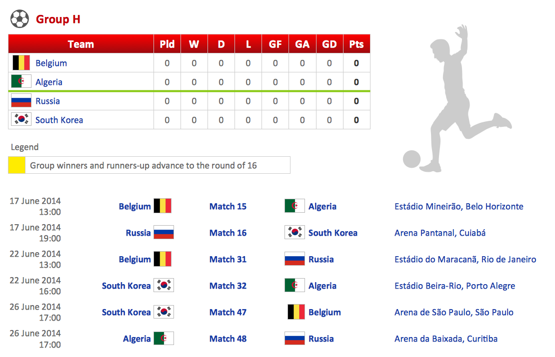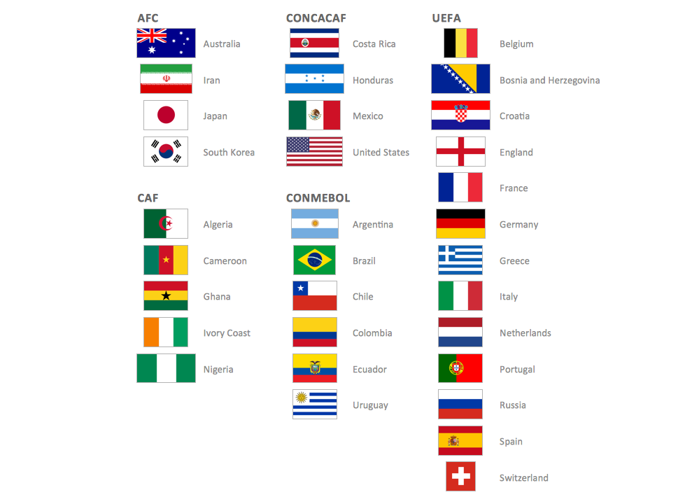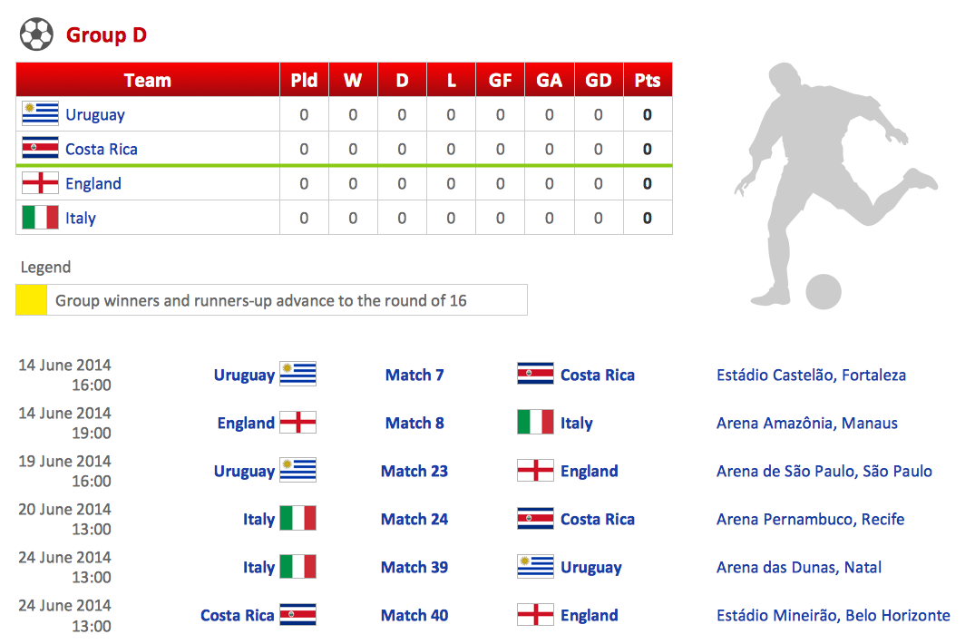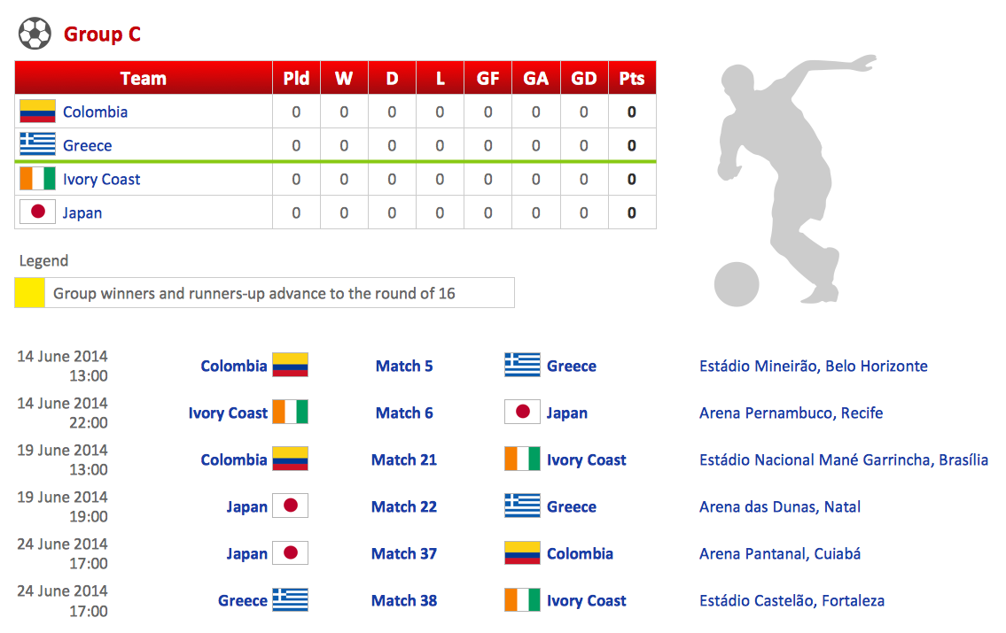 This diagram was created in ConceptDraw DIAGRAM using the "Soccer Silhouettes", "FIFA World Cup 2014 Team Flags", and "Soccer Pictograms" Libraries from the Soccer Solution. An experienced user spent 15 minutes creating this sample.