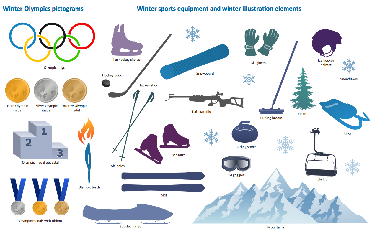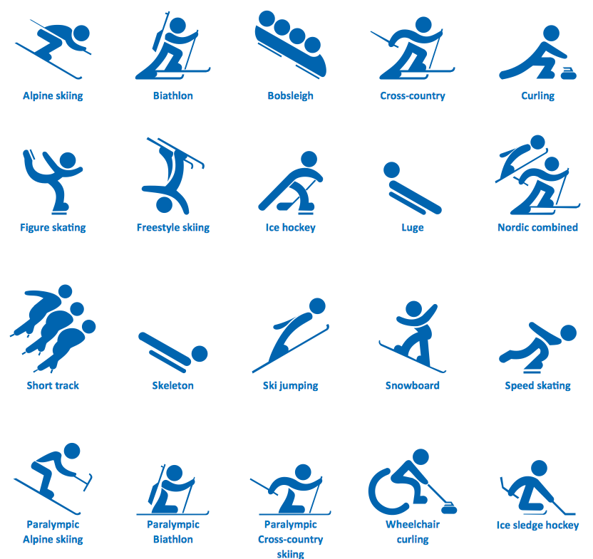 The Winter Sports solution is convenient for using by any ConceptDraw DIAGRAM user who is interested in the winter sportive activities for creating their own original winter sports illustrations, presentation slides, infographics, and blog pages.