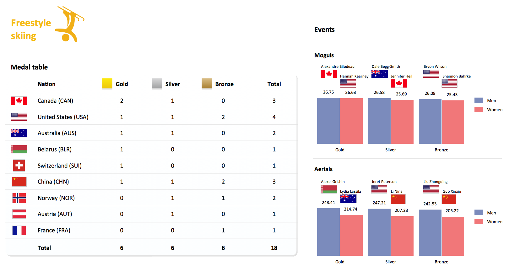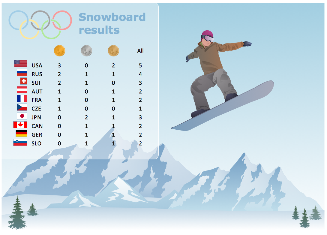 The vector illustration "Winter Olympics – Snowboard Results" was created using the ConceptDraw DIAGRAM diagramming and vector drawing software extended with the Winter Sports solution. The Winter Sports solution from the Sport Area of ConceptDraw Solution Park contains the Sochi 2014 Winter Olympics ® sports vector pictograms and clipart libraries and examples of diagrams, illustrations, and infographics.