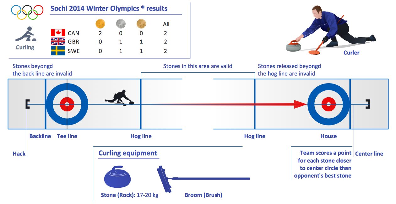 The vector illustration "Winter Olympics – Curling" was created using the ConceptDraw DIAGRAM diagramming and vector drawing software extended with the Winter Sports solution. The Winter Sports solution from the Sport Area of ConceptDraw Solution Park contains the Sochi 2014 Winter Olympics ® sports vector pictograms and clipart libraries and examples of diagrams, illustrations, and infographics.