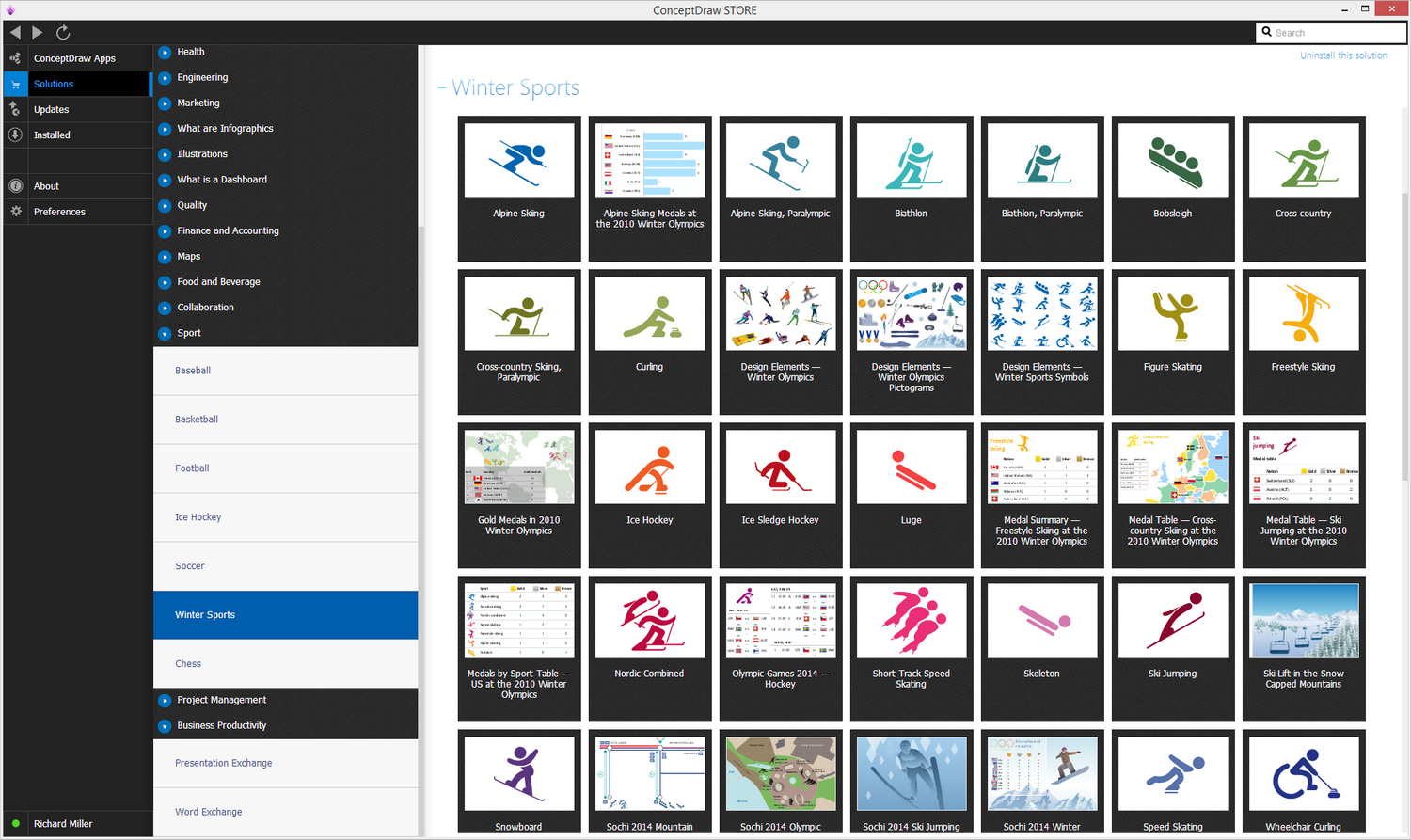 After ConceptDraw STORE and ConceptDraw DIAGRAM are downloaded and installed, you can install the Winter Sports solution from the ConceptDraw STORE.