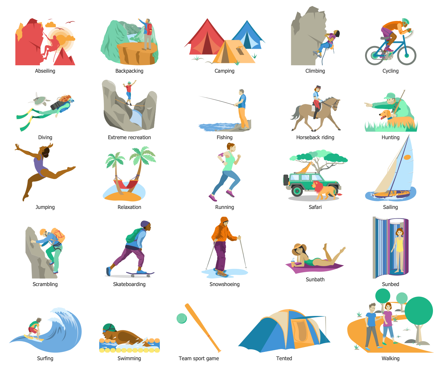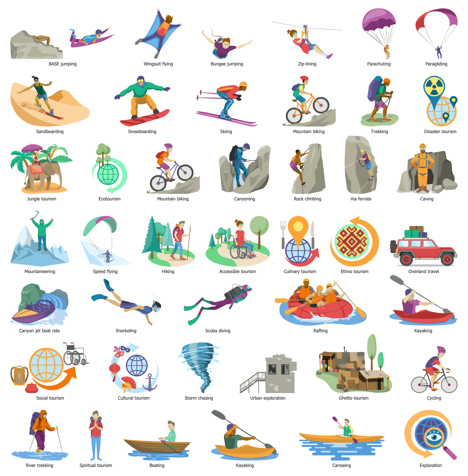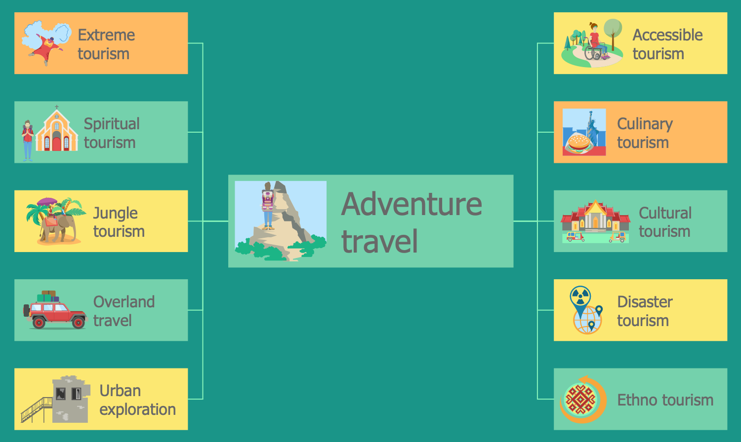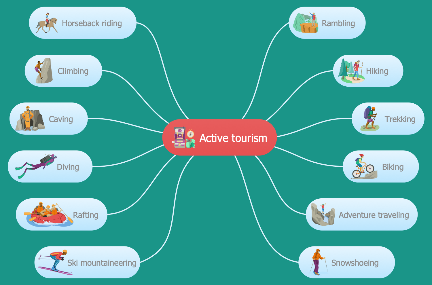This infographics sample is dedicated to active tourism and represents all variety of alternative tourism. It was designed in ConceptDraw DIAGRAM software in the form of a Mind Map with the “Active tourism” main topic and several branches surrounding it, which represent the following kinds of the active tourism: horseback riding, climbing, caving, diving, rafting, ski mountaineering, rambling, hiking, trekking, biking, adventure traveling, and snowshoeing. The alternative tourism is a fashionable modern term that appeared not so long ago but gains more popularity. At the moment it has already acquired a lot of fans and even was divided into several directions. Typically, it combines tourist products and tourist services that differ from traditional mass tourism and is its opposite. In most cases, the alternative tourism supposes the active tourism, it is developed according to the concepts and principles of the exploration or the committed tourism, introduces the travelers to the non-standard places and attractions, unique people and practices.