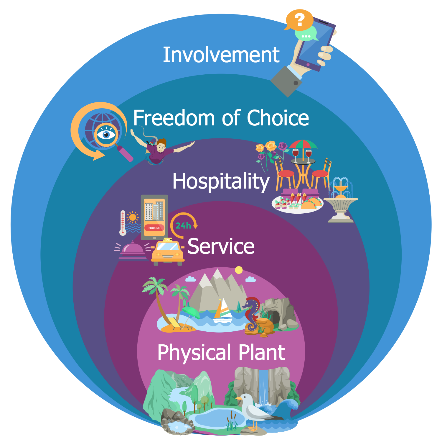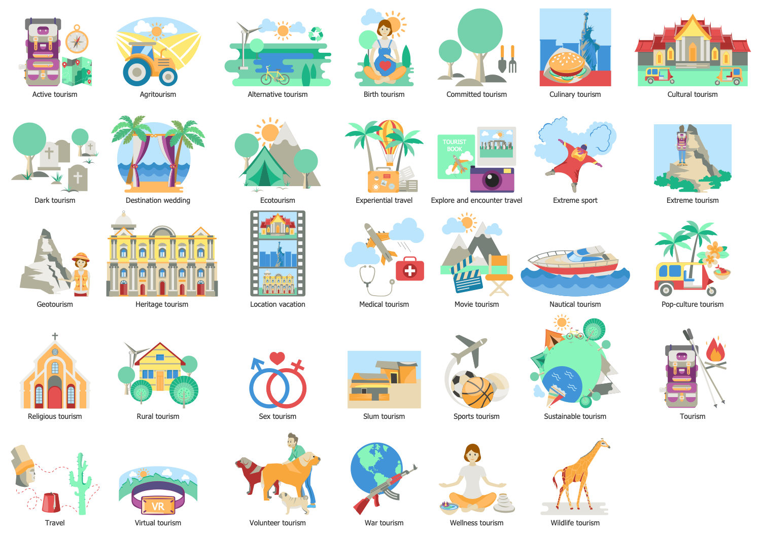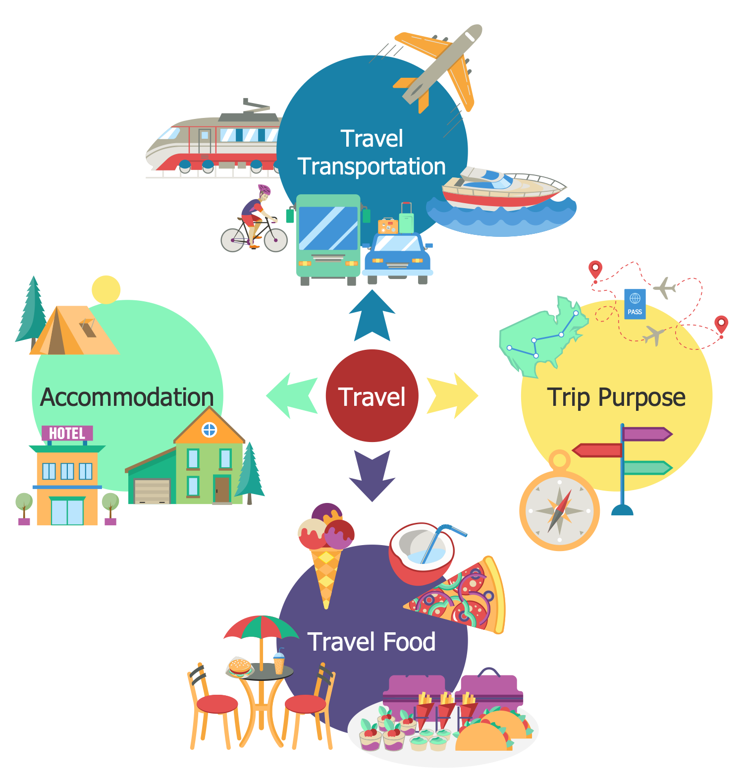 This sample represents the main travel product components. The travel product is a comprehensive complex set of the great number of services that are offered and sold to tourists, but the main components included to it are: the trip purpose (rest or work), travel transportation, accommodation, and travel food. The natural conditions, favorable environment, attractions, high-quality infrastructure and qualified tourism workers who provide these services, create comfortable conditions, propose interesting ideas and develop exciting tourist routes are equally important for the creation of an ideal tourist product. Only the correct combination of these basic components, good service, and infrastructure that meet the needs and expectations of travelers can make their rest and travel complete and unforgettable. Traveling is always associated with positive emotions, that's why the infographics and illustrations on the travel thematics are desired to be bright, colorful, positive and attractive. The best Travel Infographics solution from the ConceptDraw Solution Park provides you with a huge number of ready-made travel infographic vector objects, clipart objects, and travel infographics icons allowing to make your travel infographics exactly like this.