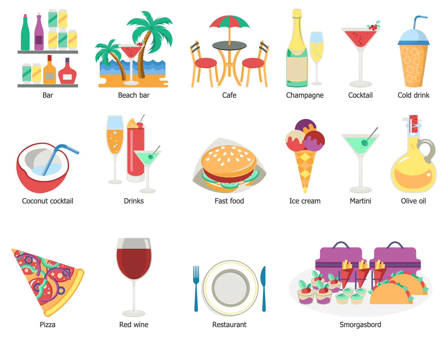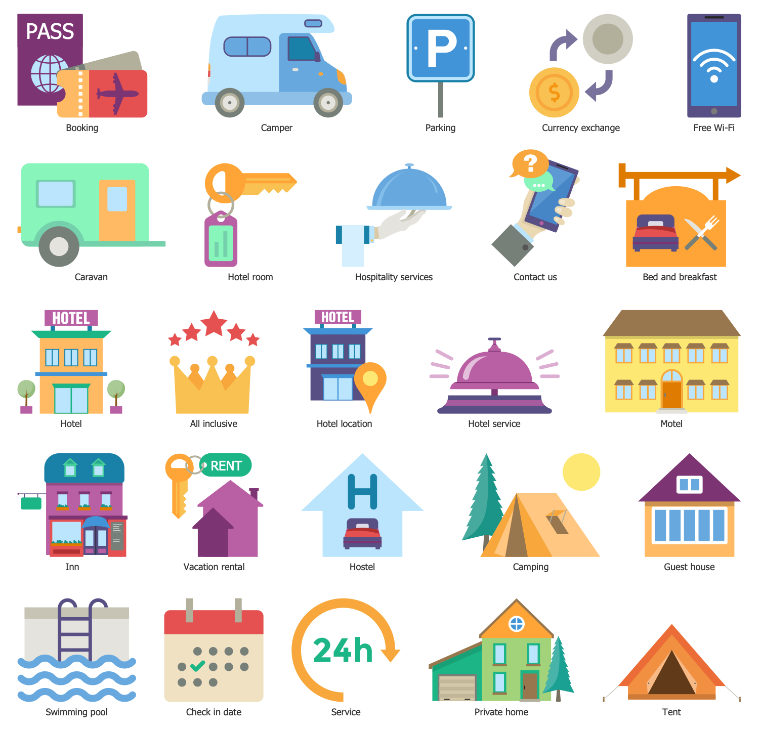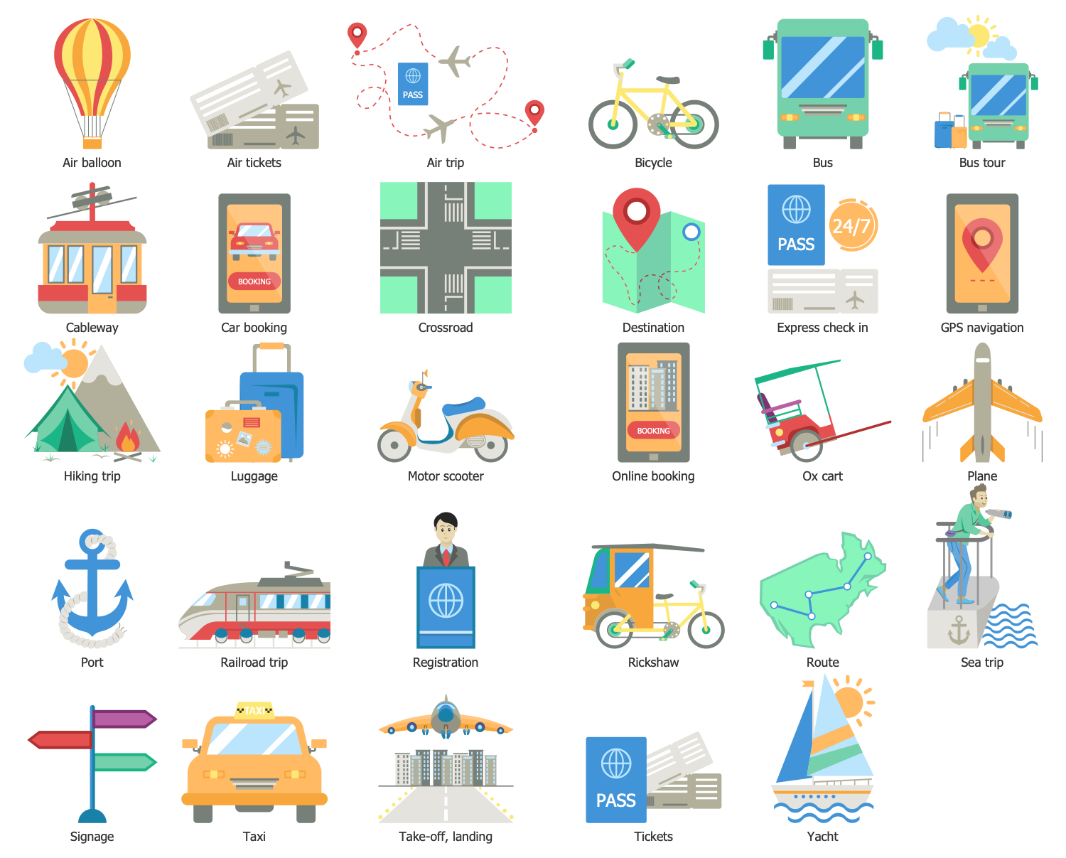 This sample represents the main travel product components. The travel product is a comprehensive complex set of the great number of services that are offered and sold to tourists, but the main components included to it are: the trip purpose (rest or work), travel transportation, accommodation, and travel food. The natural conditions, favorable environment, attractions, high-quality infrastructure and qualified tourism workers who provide these services, create comfortable conditions, propose interesting ideas and develop exciting tourist routes are equally important for the creation of an ideal tourist product. Only the correct combination of these basic components, good service, and infrastructure that meet the needs and expectations of travelers can make their rest and travel complete and unforgettable. Traveling is always associated with positive emotions, that's why the infographics and illustrations on the travel thematics are desired to be bright, colorful, positive and attractive. The best Travel Infographics solution from the ConceptDraw Solution Park provides you with a huge number of ready-made travel infographic vector objects, clipart objects, and travel infographics icons allowing to make your travel infographics exactly like this.