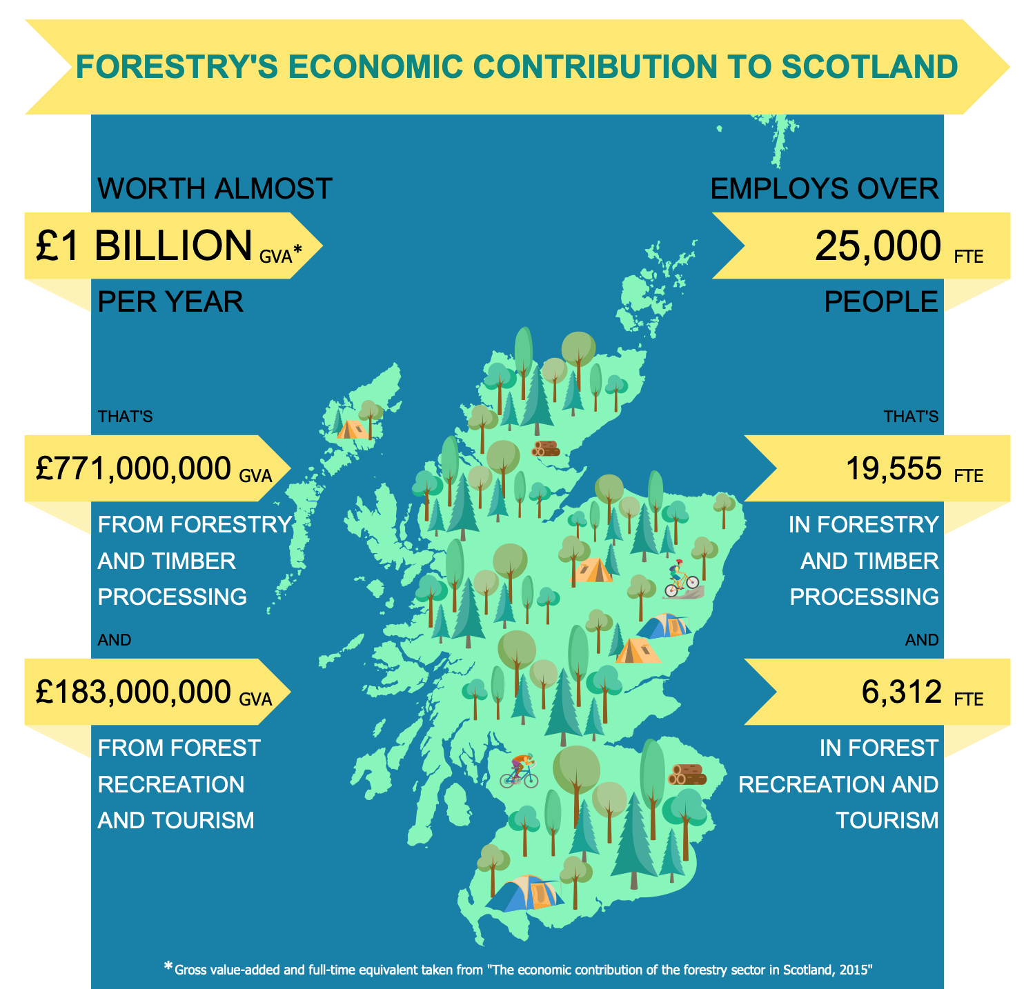 This infographic sample is dedicated to the forestry’s contribution to the economy of Scotland. The sample was designed on the base of the data and illustration from the official website of Scottish Forestry that is an organization established as an executive agency of the Scottish Government on 1 April 2019. This illustration reflects the data from the report on the economic value of the forestry sector in Scotland, in 2015. According to the report and this diagram, the Scottish forestry contributes nearly £1 billion GVA to Scotland's economy per year. The forestry's and timber processing economic contribution to Scotland is £771 million GVA, while the contribution of forest recreation and tourism is £183 million GVA. The employment levels are up and now there are more than 25,000 FTE people working in this sector, among them 19,555 FTE people in Scotland are employees of the forestry and timber processing, and the forest recreation and tourism employ 6,312 FTE people in Scotland. Using this sample as a travel infographics template, you can depict the key performance indicators in the tourism sector for other countries.