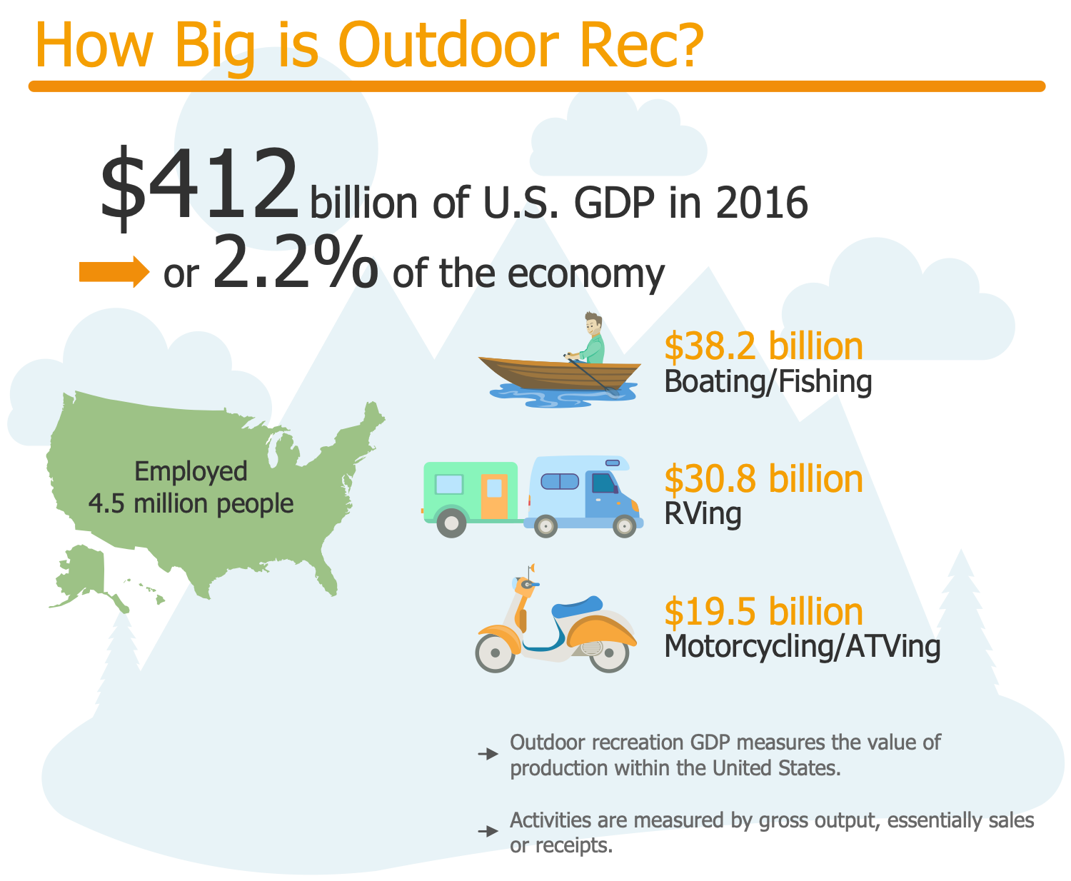 This infographic sample is based on the data from the website of the U.S. Bureau of Economic Analysis (BEA) and narrates how big outdoor recreation was in 2016. According to the published data, the outdoor recreation economy accounted $412 billion of U.S. GDP in 2016 or 2.2 % of the overall economy. You can also see that 4.5 million people were employed in outdoor recreation. It is generally accepted that the outdoor recreation activities comprise three categories: conventional core activities such as boating, fishing, bicycling, hiking, and hunting; supporting activities such as travel, tourism, local trips, construction, and government expenditures; and other core activities such as gardening and outdoor concerts. In the Outdoor Recreation Satellite Account in 2016, the great measure of receipts associated with the outdoor recreation economy was presented by the Boating/Fishing accounting $38.2 billion of the real gross output, RVing accounted $30.8 billion, and Motorcycling/ATVing activities accounted for $19.5 billion of the real gross output.