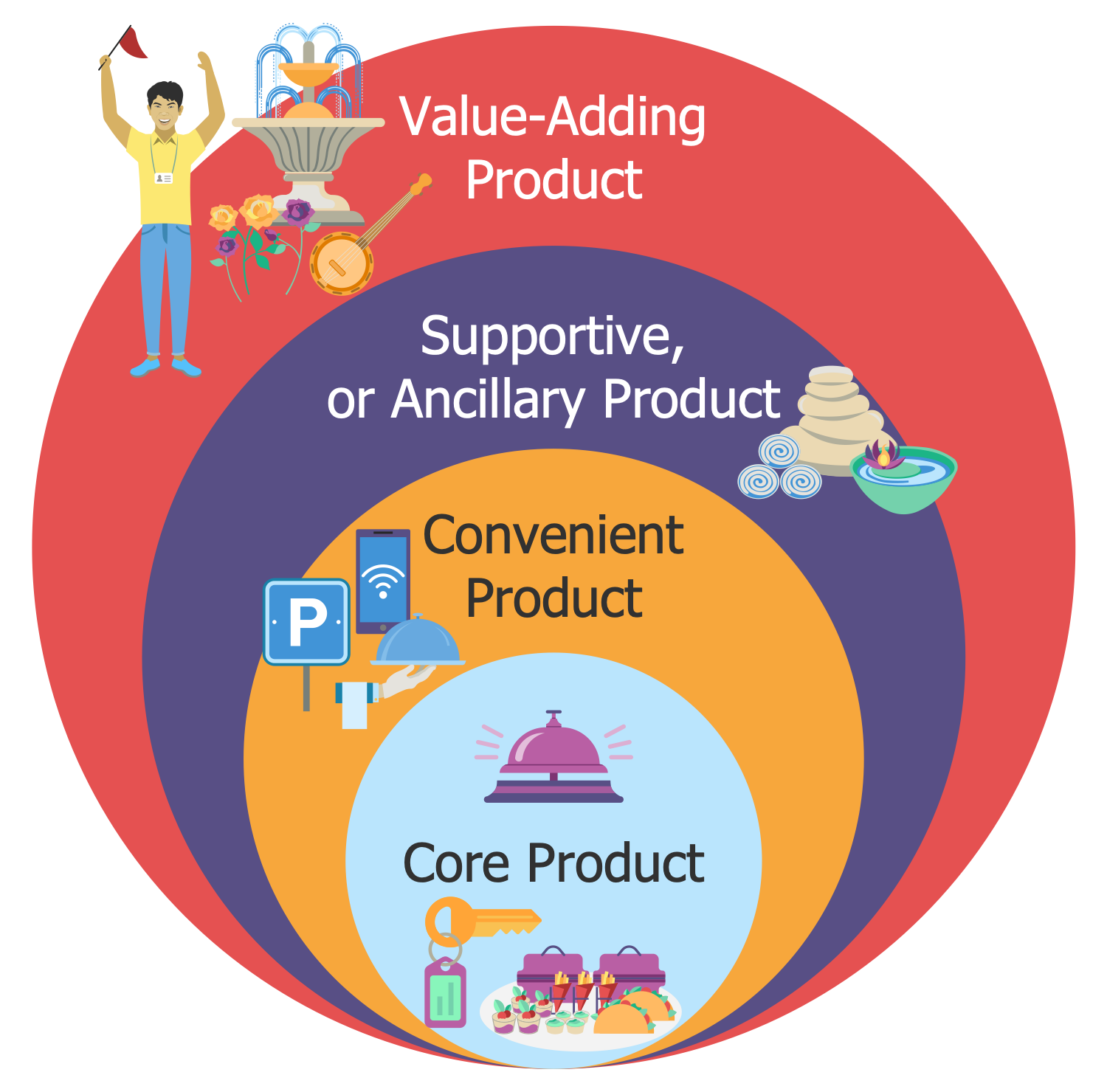 This sample illustrates the main levels that the tourism product passes in its development. There are represented four levels: core product, convenient product, supportive or ancillary product, and value-adding product. The core product lies at the basis, it is the main product that is designed for defined target groups with the basic needs. The convenient product is a product or service without which the main product can't be used. Then you can see the supportive or ancillary product, which adds to the main product the features that will beneficially distinguish it from the competitors. Finally, is represented the value-adding product that includes all the products and services that make the product more attractive, these are the high-level service, culture, hospitality, etc. This diagram is presented as circles nested one into another, beginning from the core one. Being bright through the use of eye-catching colors, this diagram is additionally decorated with vivid clipart, which makes it even more memorable.