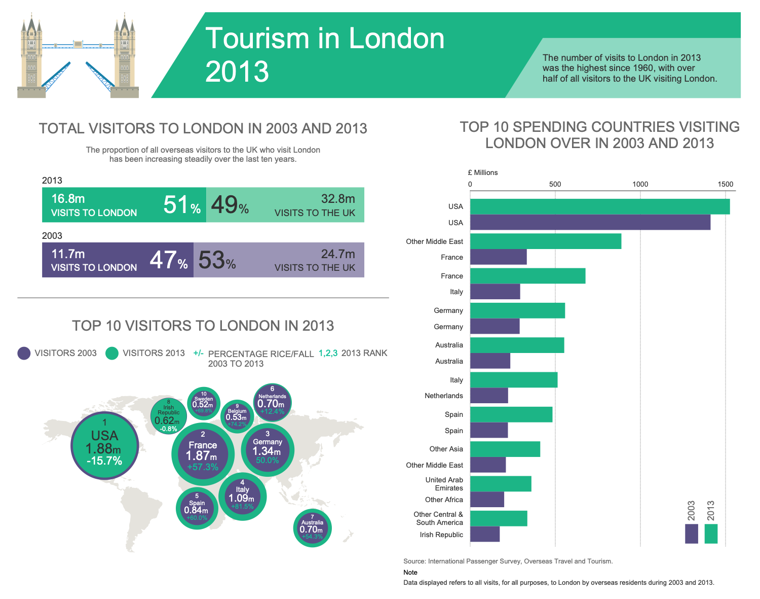 This infographics sample reflects the situation in a tourist sphere in London in 2013. The statistics shows that tourism in London in 2013 was very successful. Moreover, the number of visitors was the highest since 1960. It is also known that over half of all visitors to the UK visit London and the comparison of data showed that the quantity of London visitors steadily increased from year to year over the decade from 2003 to 2013. You can also see the summary charts with numbers of visitors by countries of residence and their percentage ratios. The data are presented as Top 10 for both 2003 and 2013, and are visually represented in the form of circles on the world map and in a form of a Bar Chart. The counted data include all residents visited London for any purposes. To display data for 2003, the purple color was used, while for 2013 was applied the green color. This visual distinction is convenient for correct and quick perception of the charts.