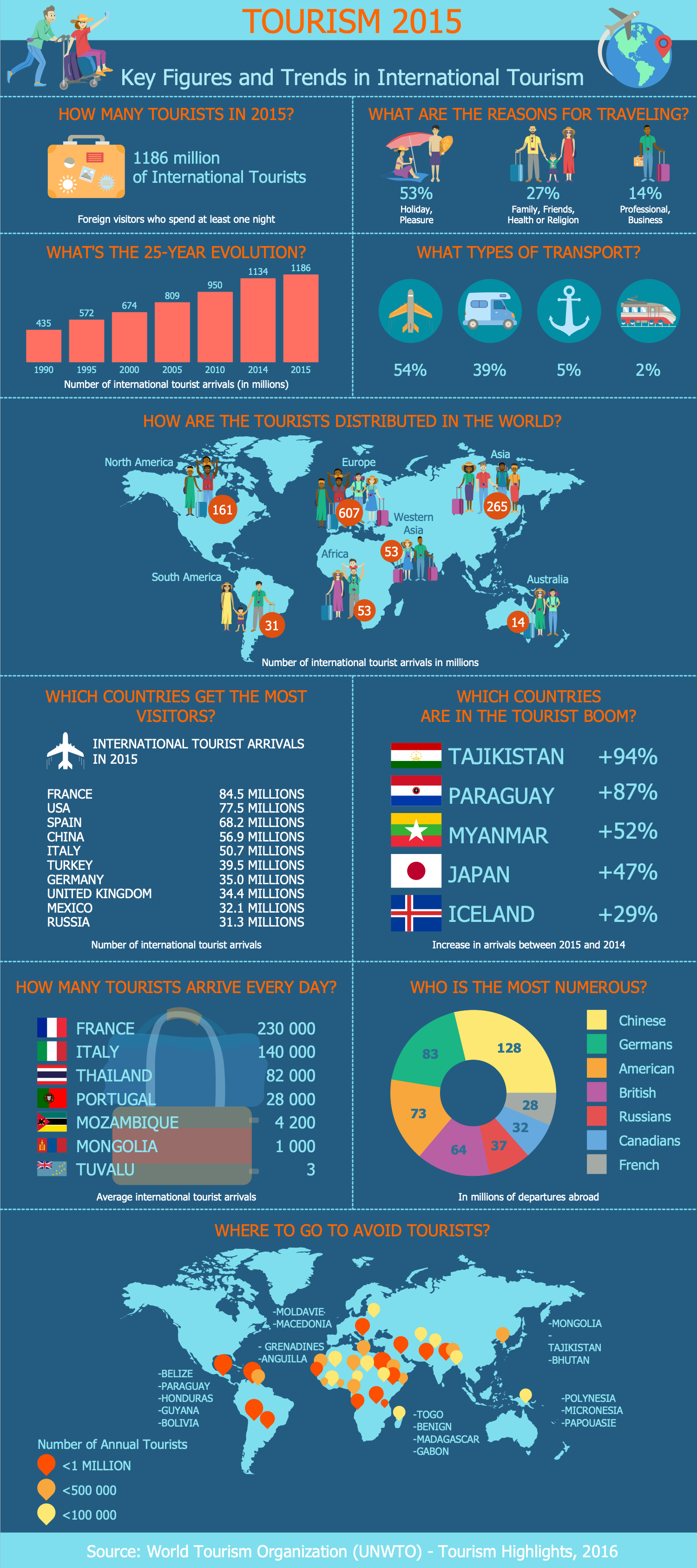 This business travel infographics sample represents the key figures and trends in international tourism in 2015. Here, you can find that there were 1186 million of international tourists in 2015. There are represented the results of a survey of travelers about the reasons of their traveling, thus 53% of tourists travel on holiday and for pleasure, 27% travel to family, friends, by reason of health or religion, and 14% travel for work and business issues. The included Bar Chart shows that the number of international tourist arrivals has steadily grown over the past 25 years and increased from 435 million in 1990 to 1186 in 2015. The most popular way to travel is by plane (54%), a little fewer of tourists use cars (39%), even less prefer maritime transport (5%), and the trains are least popular (2%). On the bright graphics, you can also see how the tourists are distributed in the world, which countries get the most visitors and are in the tourist boom, statistics on how many tourists arrive every day, what nationality is the most numerous among the travelers, and where you can go to avoid many tourists.