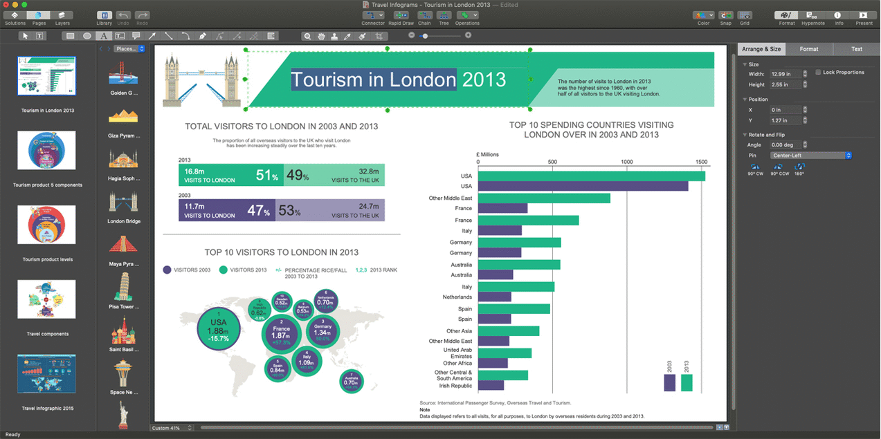 Start using the Travel Infographics solution to make the professionally looking illustrations by adding the design elements taken from the stencil libraries and editing the pre-made examples that can be found there.