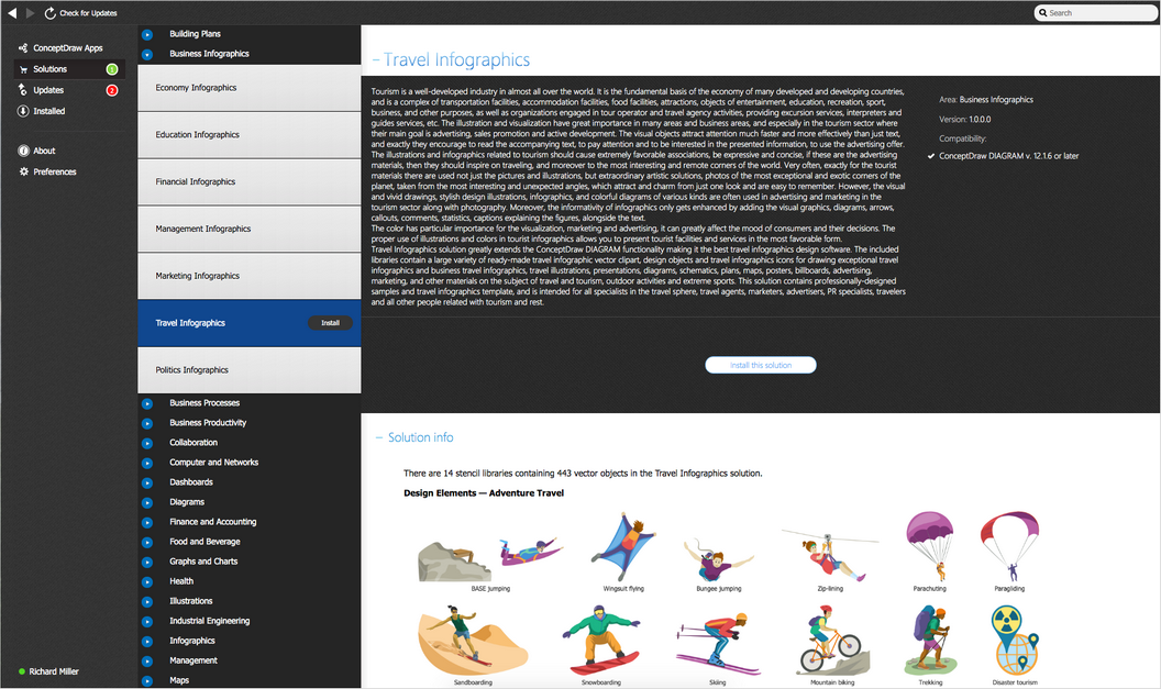 After ConceptDraw DIAGRAM is installed, the Travel Infographics solution can be purchased either from the Business Infographics area of ConceptDraw STORE itself or from our online store. Thus, you will be able to use the Travel Infographics solution straight after.