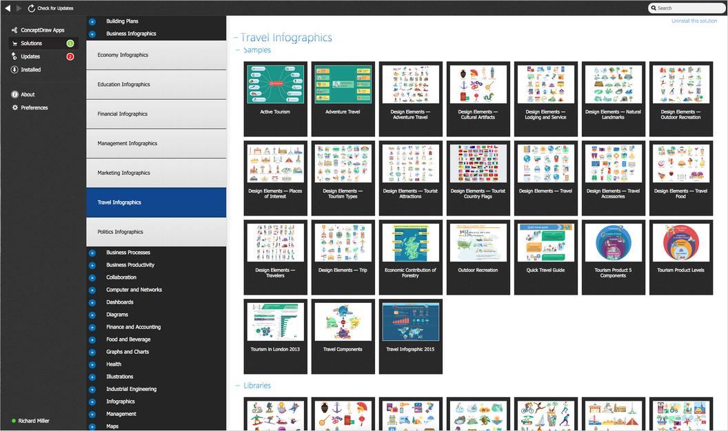 First of all, make sure that both ConceptDraw STORE and ConceptDraw DIAGRAM applications are downloaded and installed on your computer. Next, install the Travel Infographics solution from the ConceptDraw STORE to use it in the ConceptDraw DIAGRAM application.